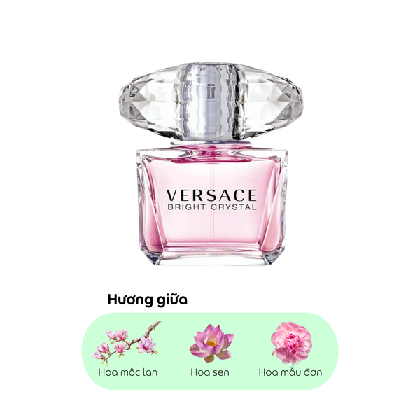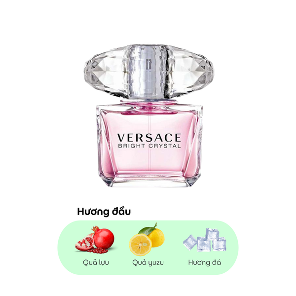 Nước Hoa Nữ Versace Bright Crystal Edt 30ml được mở đầu quá đỗi đáng yêu xen lẫn sự tươi mát của Cam Yuzu hoà cùng Quả lựu ngọt ngào, cả hai đều được đắm mình trong làn Nước đá nên khi vừa chạm mũi tôi như gột rửa đi mọi phiền muộn. Hẳn là bạn nghĩ mình đang lạc vào một rừng hoa, với nét trong trẻo của Hoa sen, Hoa mẫu đơn mềm mại và Hoa mộc lan tinh nghịch cứ thay nhau toả hương dịu dàng tại tầng hương giữa này. Kết thúc cuộc hành trình bằng nốt hương Hổ phách gần gũi và Xạ hương sạch sẽ khiến bạn mang hoài một cảm giác bồi hồi, vấn vương về mùi hương này.